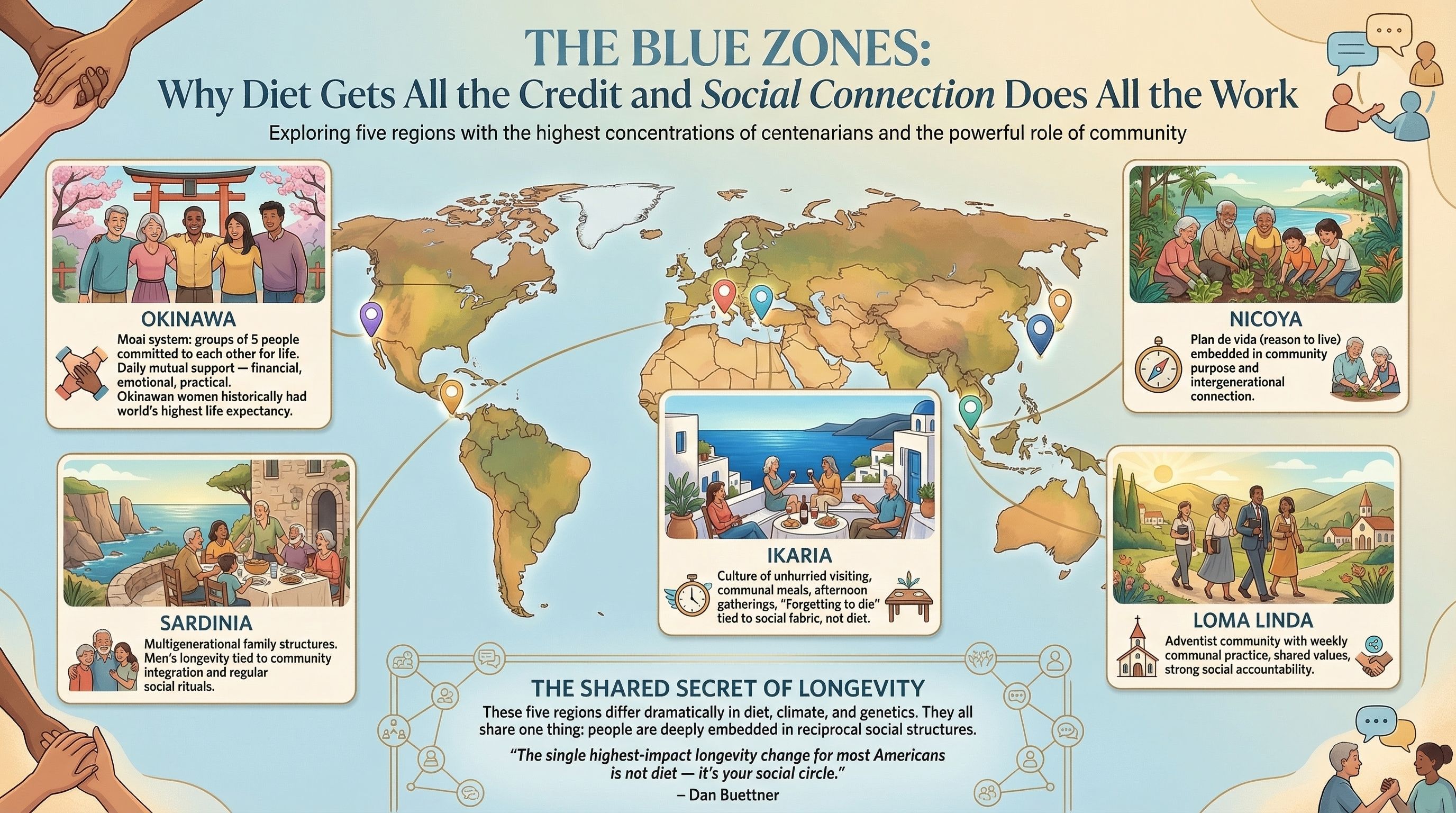 The diet conversation around Blue Zones gets enormous attention. The social structure conversation gets almost none, despite the research suggesting it may be the more powerful variable.