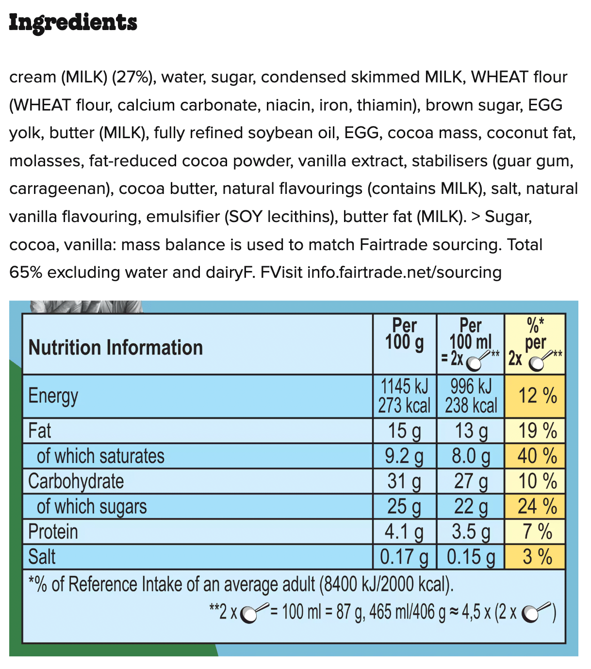 Fairtrade Certified - At least 65% of ingredients (excluding water and dairy) are Fairtrade sourced, ensuring fair wages for farmers.
